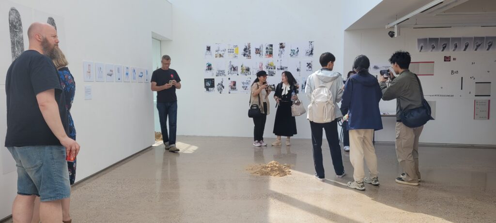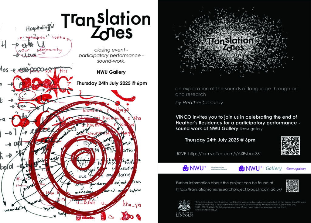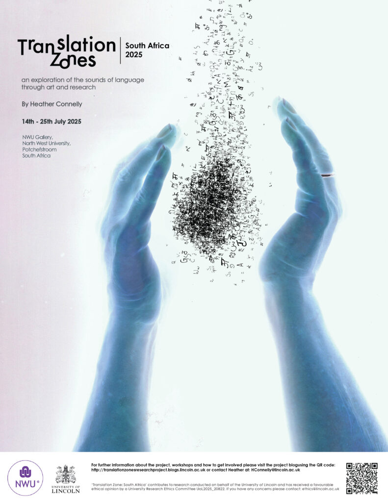 Last week I was able to use the gallery as my studio to experiment with ideas in preparation for my residency at North West University, South Africa in July. This was part of the Lincoln School of Design & Architecture (LSDA) staff exhibition and work in progress, Project Space + Gallery, University of Lincoln: an eclectic array of projects, based on our areas of practice and research. It was a great opportunity to see colleagues working on ‘new beginnings, new endings and the stuff inbetween’ – the conversations where inspiring and insightful. Working in a physical space with the materials, texts and ideas enabled me to think more about the body and our relationship to the languages we speak and the sounds that we make as I develop a polylingual score that explores the languages of South Africa. Updates on the project will be posted here: Translation Zone(s): South Africa during the residency (14th -25th July 2025).
